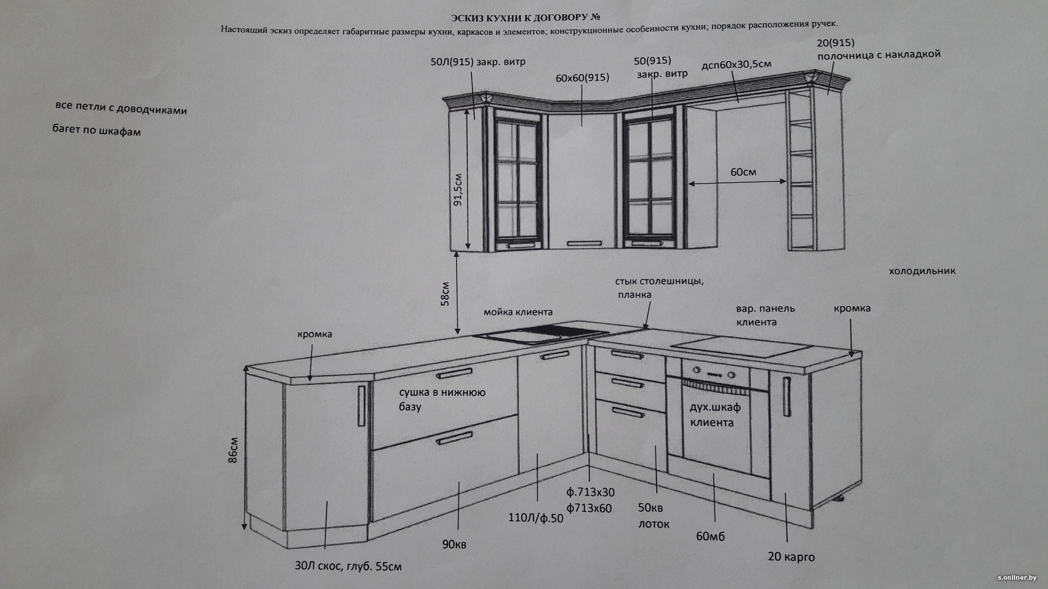 Минимальная дистанция от половых шкафов до нижней стенки – 45 см. Следовательно, стандартные габариты изделия будет иметь ограничение 45 см +2 см = 47 см. Промежуток 20 мм – слегка заходит за столешницу.