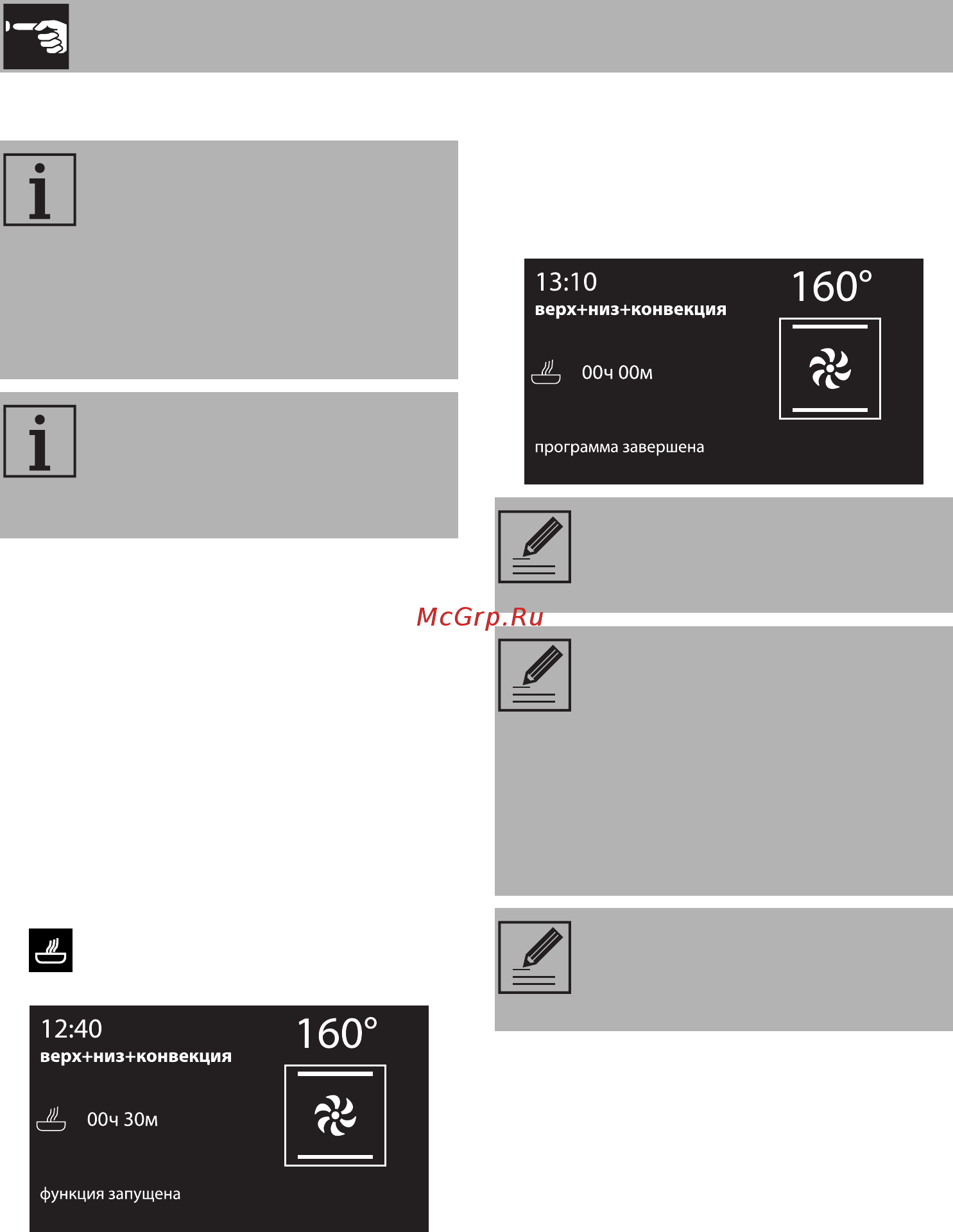 Функции конвекции в комбинации с грилем усиливают возможности подогрева еды, которая готовится в духовом шкафу.