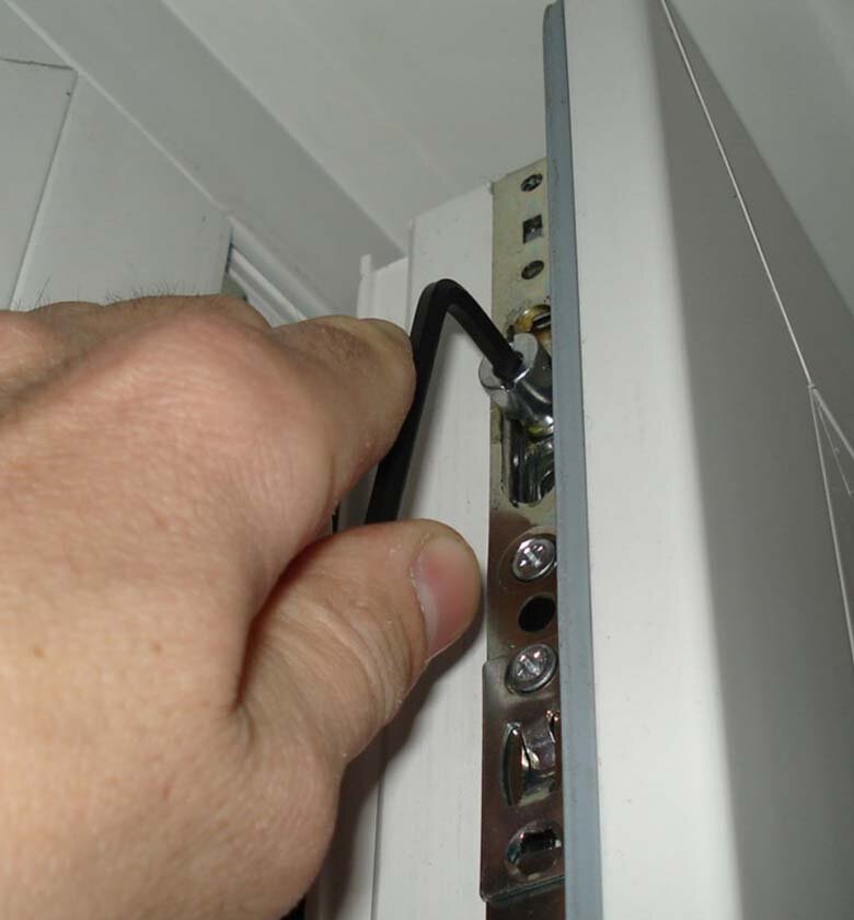 Иногда со временем начинают казаться, что подоконники цепляются за пластиковые двери. Ремонт в этом случае предполагает поднятие створки. Для этого используется регулировочный винт (под ключ), который находится в нижнем конце петли.