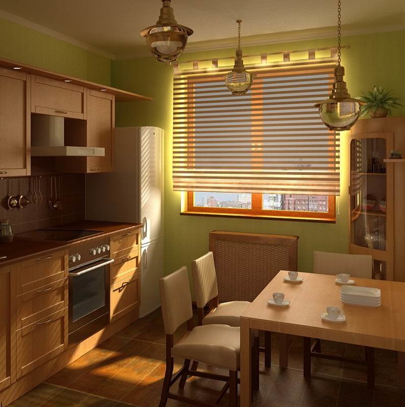 Достаточно универсальными вариантами для малогабаритной кухни являются жалюзи и рулонные бамбуковые изделия. Еще одно удобное решение — складывающиеся гармошкой римские шторы.