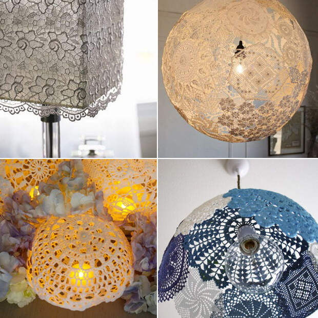 Можно старый абажур настольного светильника просто обтянуть кружевом и задекорировать лентами