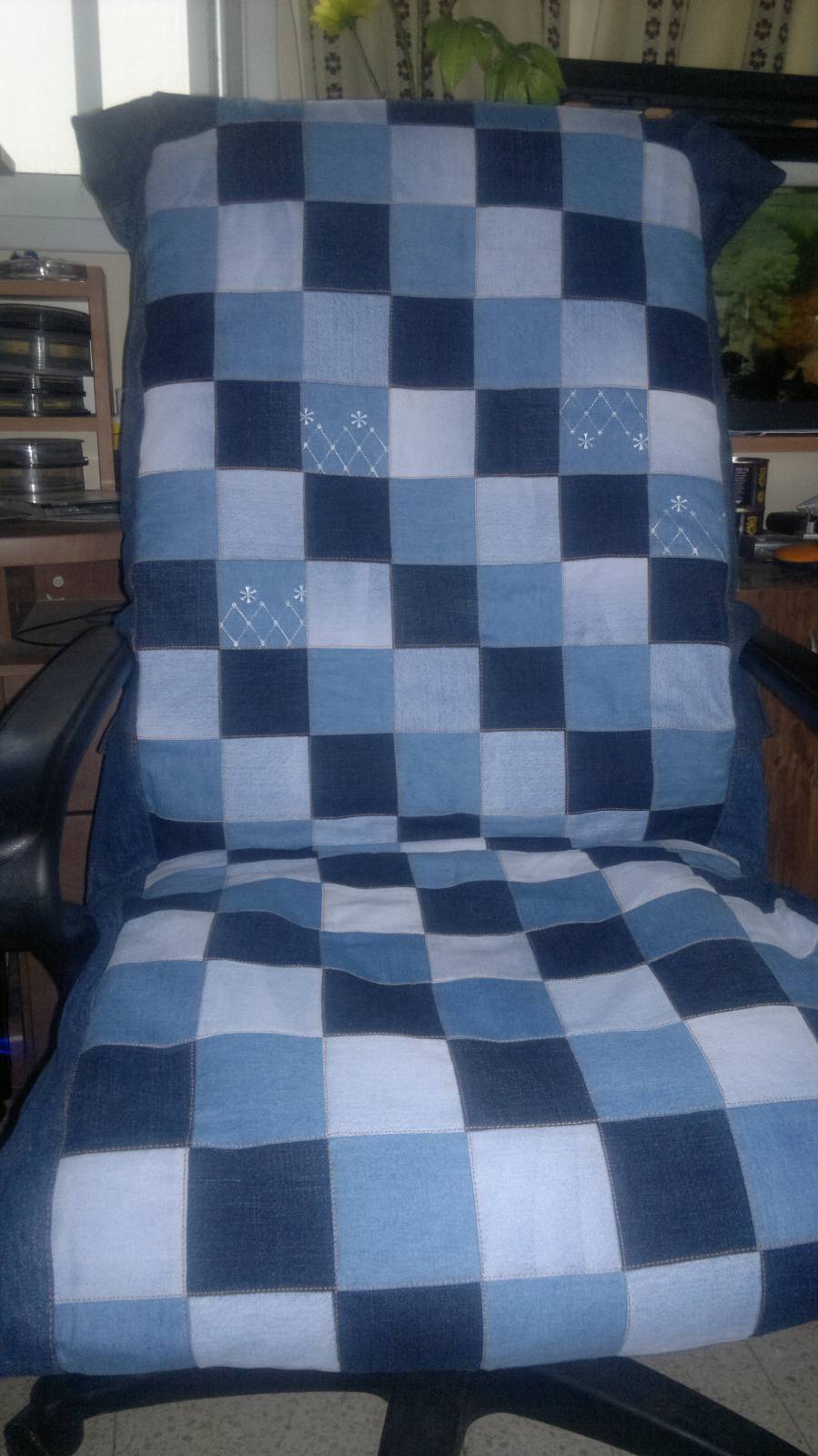 Я нашла этот красивый джинсовый чехол на стул, и я думаю, что он потрясающий. Чтобы сделать дно сиденья, вам нужно будет обернуть ткань вокруг банки и прочее. Прикрепите банки к основанию и подушке. Из старых джинсов сделайте достаточно большой кусок для сиденья, а затем сложите его под стул.