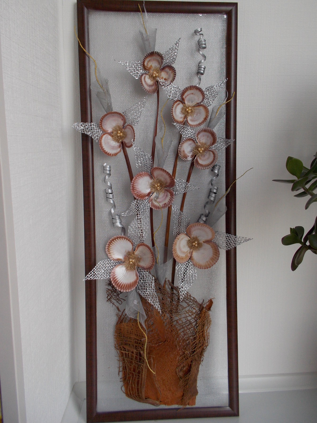 Вырезаем из плотного картона форму, любую фигуру, проделываем отверстие для веревочки, полностью заклеиваем ракушками в любом порядке, главное, чтобы промежутки между ними были минимальными. В дырочку продеваем шпагат, завязываем красивыми узелками, сушим – и панно готово.