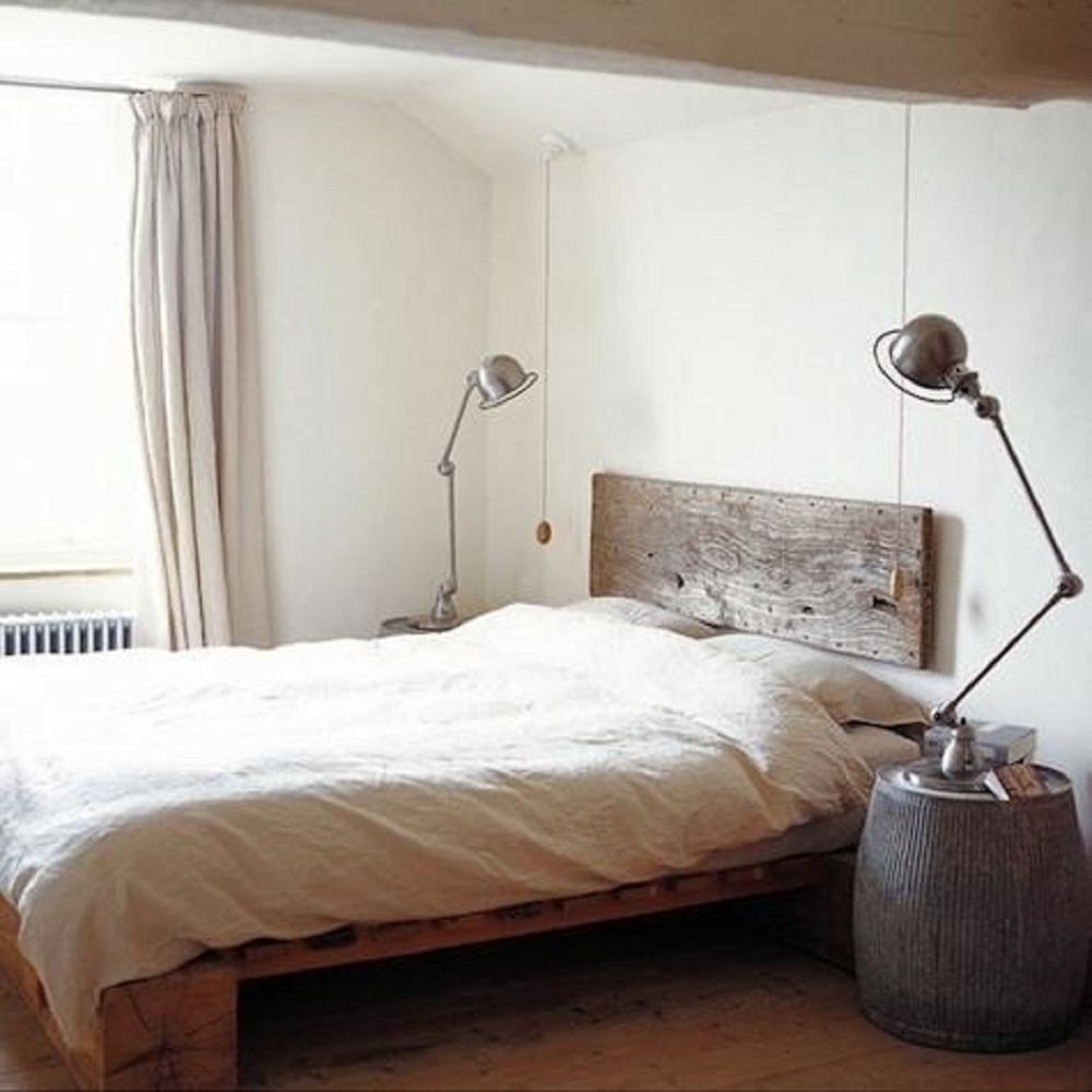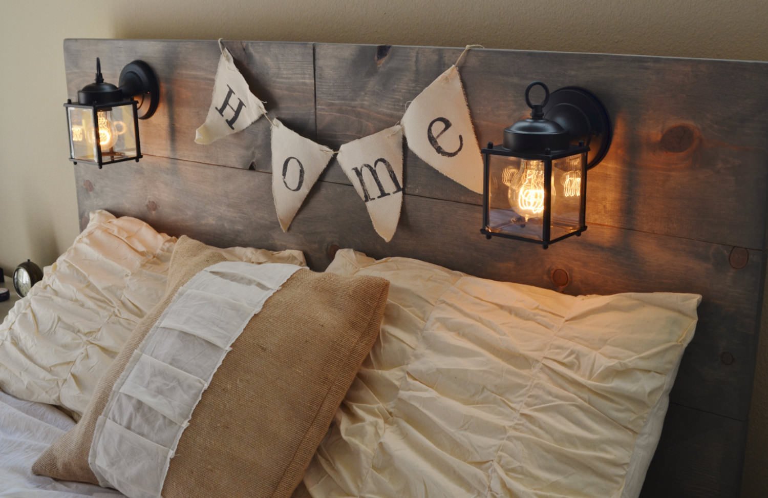 - Один из самых простых вариантов — изголовье, собранное из готовых покупных досок. Остаётся только закрепить их на стене и добавить бра.