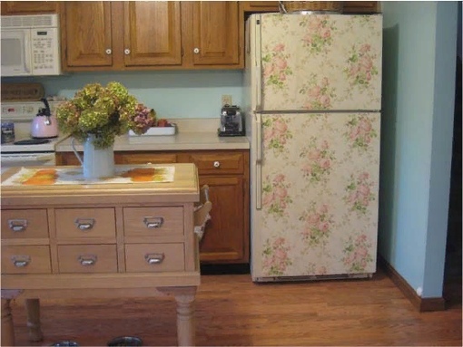 Преображение холодильника с помощью обоев и дерева.