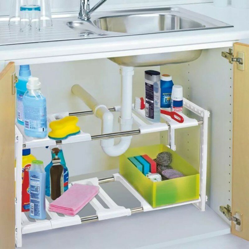Если вы можете найти его подходящего размера, это простое решение для упорядочивания чистящих средств для раковины, а также для улавливания галлонов потенциальной воды.Это не сработает для всех кабинетов, но для получения результатов нет ничего проще.