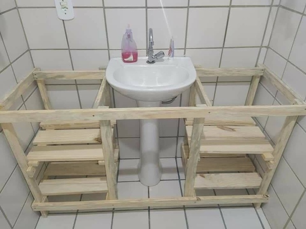 - Использовать для изготовления тумбы любой подручный материал, оставшийся от ремонта, которым вы располагаете – деревянные брусочки, простой или ламинированный ДСП, готовые полки от шкафов, шурупы, уголки.
