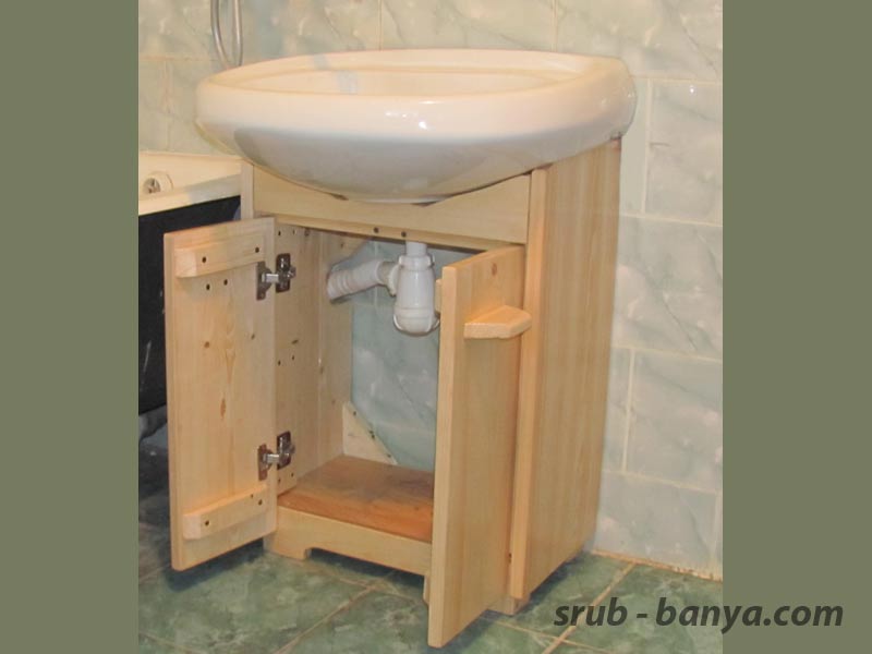 Для увеличения места хранения изготовить полку. Она должна легко сниматься и ставиться на место. Для этого в ее середине от стены выпиливается глубокий прорез, нужный для прохода трубы канализации. Положить на бруски, закрепленные шурупами к стенкам шкафа.