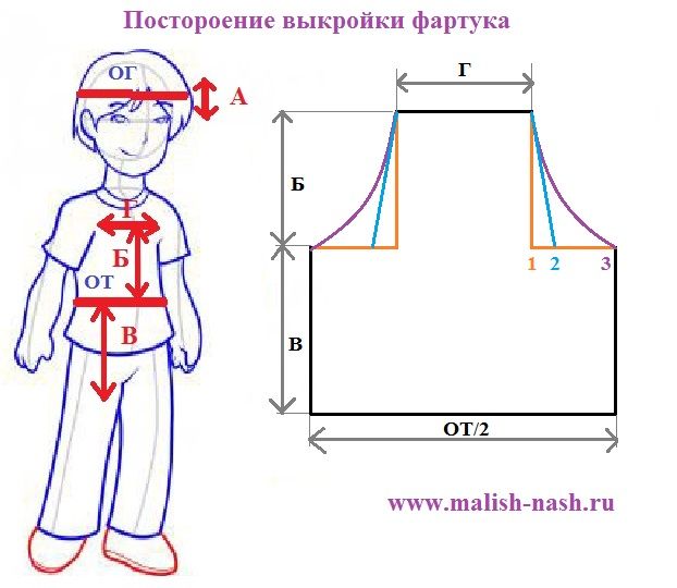 - Ширина фартука = полу-обхвату бёдер (как снимется показано на рис.