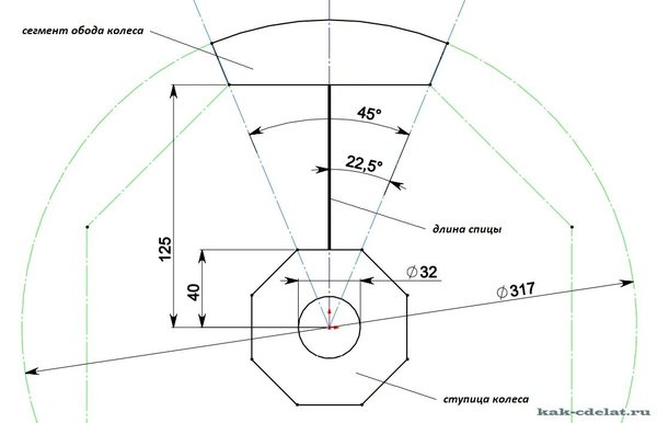 На следующем этапе мы сделали чертёж деревянного колеса в натуральную величину. На миллиметровую бумагу перенесли размер ступицы, определили диаметр изделия – 60 см, количество спиц выбрали 8. Нарисовали всё на бумаге и замерили размеры получившихся деталей.
