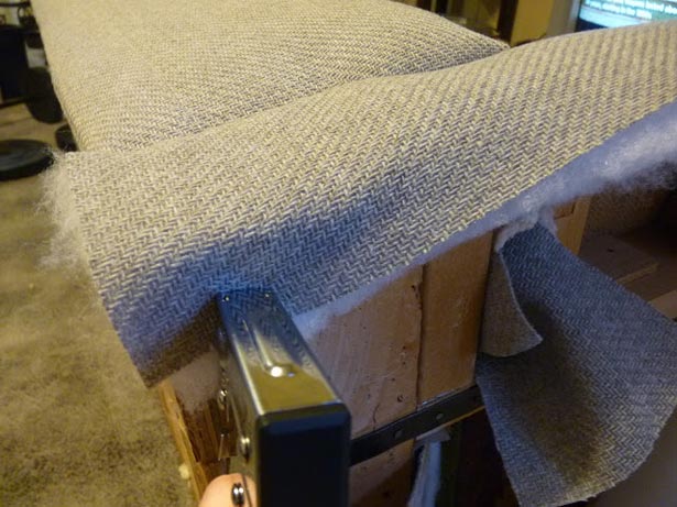 Я вырезал полоски ткани шириной в несколько дюймов и загнул их по краю. Используя декоративные шляпки гвоздей, я прикрепил эти полосы к каркасу дивана, убедившись, что они полностью закрывают края фанеры.Когда я добрался до внешних углов, где встречаются две секции дивана, я использовал скобы вместо шляпок гвоздей. Таким образом, между двумя частями не будет больших зазоров, так как шляпки гвоздей будут выступать наружу.