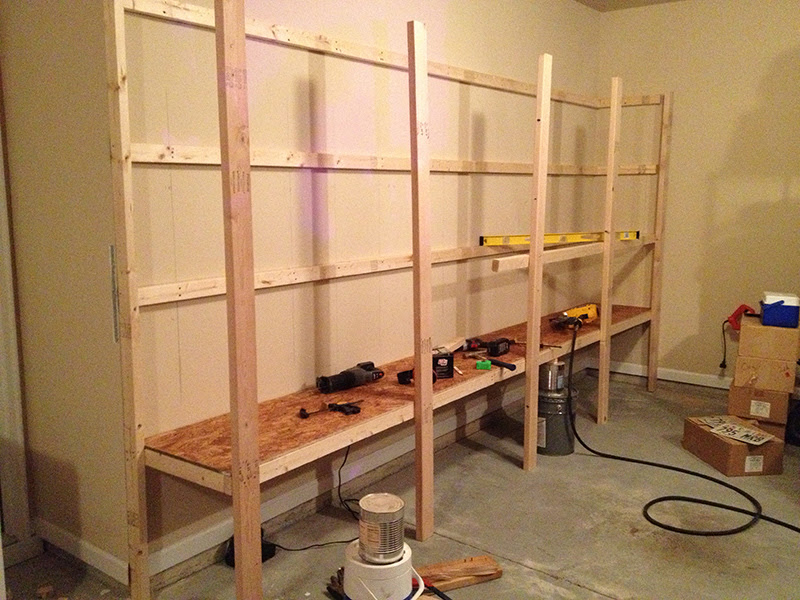 О размере ширины полки горячо спорят, но мы остановились на глубине 16 дюймов.Он достаточно глубокий, чтобы выдержать ящики для инструментов и стандартные ящики, но достаточно неглубокий, чтобы не потерять вещи в спине и не доставать слишком далеко. Наши полки вырезаны из плит OSB 1/2 дюйма и имеют длину шесть футов. Мы использовали циркулярную пилу, чтобы разрезать наши полки, но если вы принесете свои измерения в Home Depot или Lowe’s, они могут сделать разрезы за вас на своей гусеничной пиле, что сэкономит вам ни шагу.