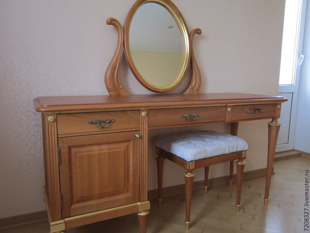 Этот вариант — для более продвинутых в столярном мастерстве. Его изготовление потребует некоторых навыков работы с деревом, аккуратности и внимательности. Как сделать классический туалетный столик своими руками, подробно рассказываем дальше.