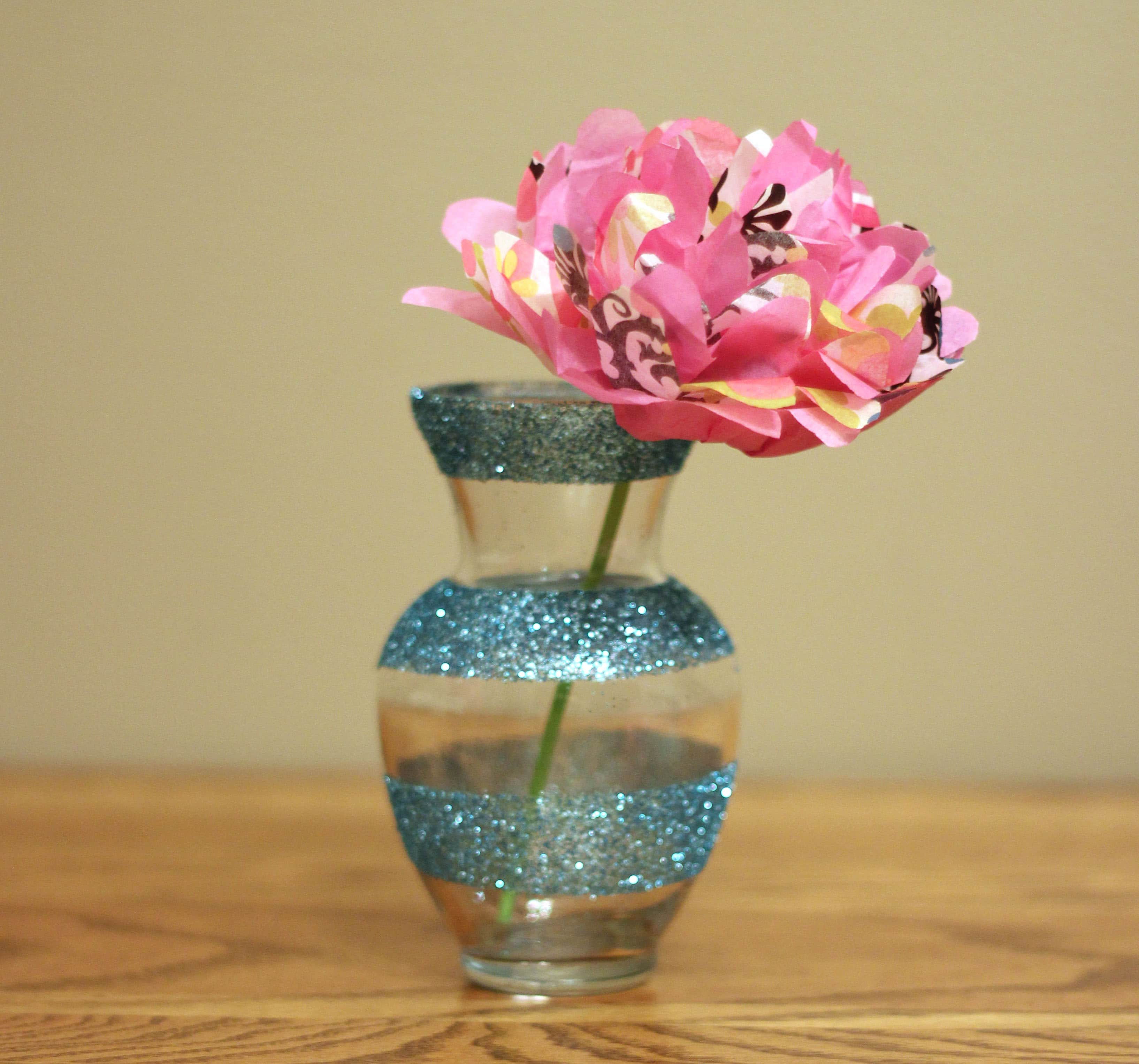 Можно клеить блестки, ленточки, расписывать стекло. Вот несколько вариантов декора вазы для цветов своими руками.